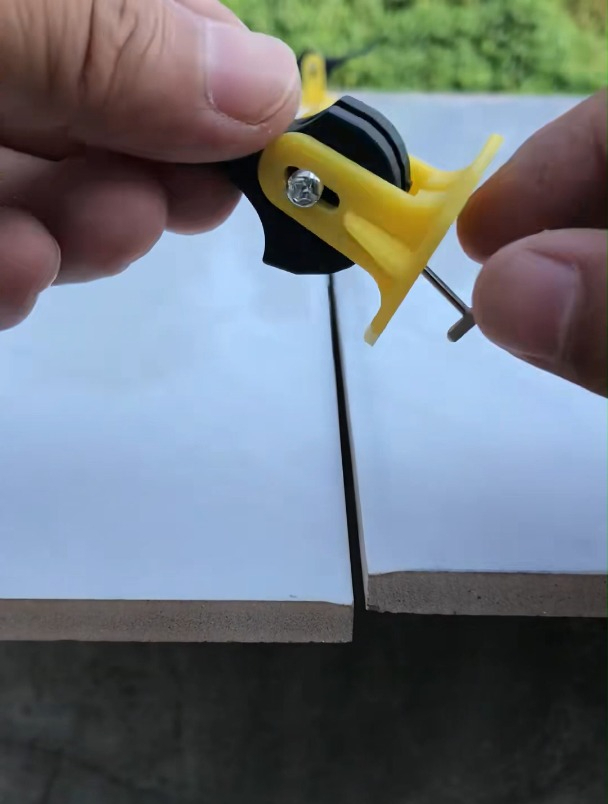 瓷砖找平器,一般以卡扣型拧盖型为主,由三部分构成,塑料底座插片推紧钳,把这三部分拆下即可取出找平器塑料底座是一次性的,放置在相邻两片瓷砖的中间,配套插片和推紧钳固定夹紧当瓷砖背面的瓷砖胶干固并牢固粘贴后,用橡胶锤敲断底座上部即可而插片主要用于固定底座和瓷砖,提高瓷砖。